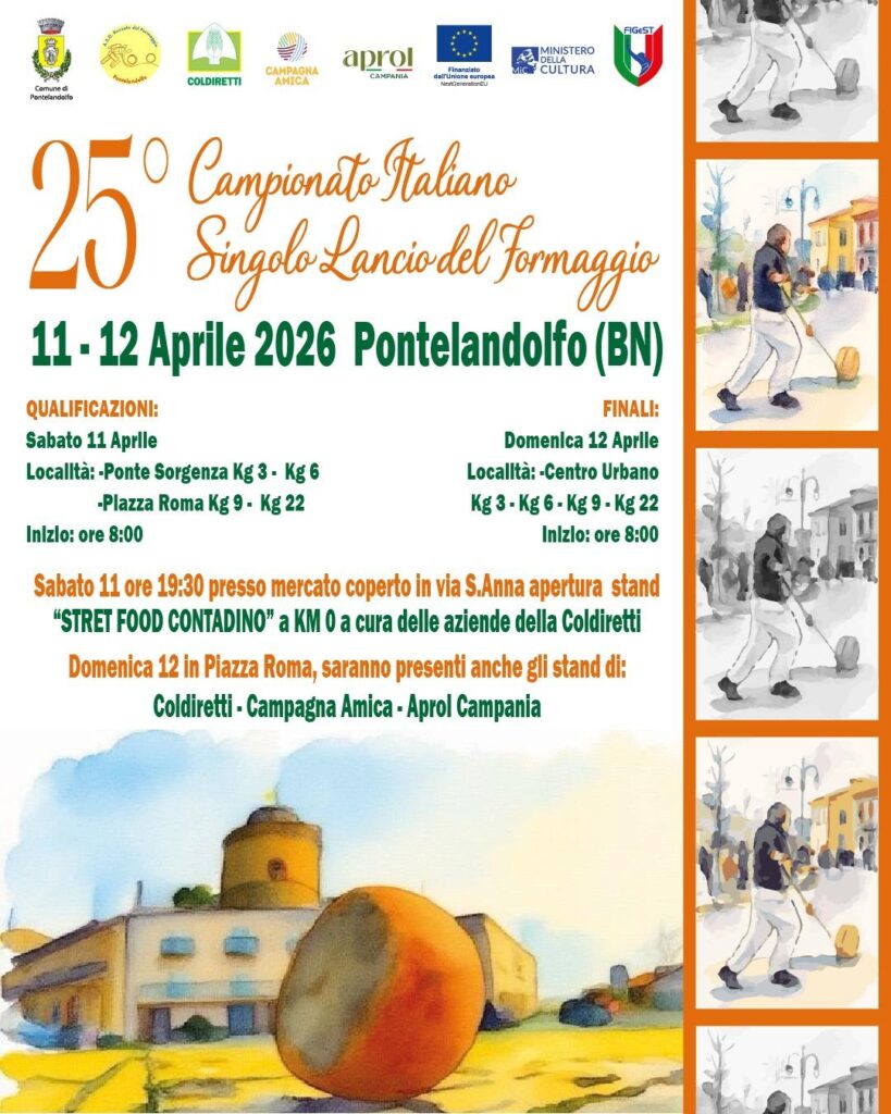 Il prossimo 11 e 12 aprile 2026, Pontelandolfo diventerà il cuore pulsante delle tradizioni popolari italiane ospitando la 25ª edizione del Campionato Italiano di Lancio del Formaggio (singolo). Un traguardo prestigioso, il quarto di secolo, che rappresenta un momento di fondamentale importanza non solo per la nostra Associazione, ma per l’intera comunità.